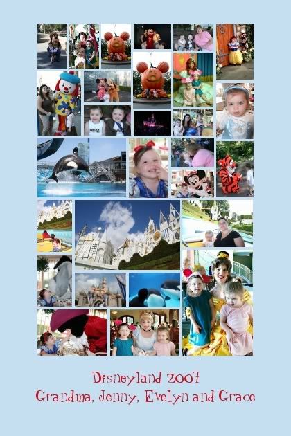 We just recently got back from California. We had a blast and did not want to come home. Unfortunately the San Diego fires gave us no other choice. My Mom, the Girls and I flew into Anaheim on Monday Oct 15th, where we enjoyed Disneyland for 4 incredible days. We all had a great time dining with the characters, going on rides, walking, walking and more walking. Oh and don't forget about the shopping! You know with Grandma there, we did some shopping. The Girls were spoiled rotton. Grandpa and Grandma Furuya sent them with cash to spend, Grandpa and Grandma Charles the same, and having Grandma Gerk there with her credit card they did some damamge! Friday morning Steve flew in to meet us for our last day at Disney and then we drove down to San Diego for the rest of our trip. Saturday we met Grandma Diane at Seaworld where we watched the Shamu Believe show and LOVED IT. Of course Steve and Evelyn chose seats for us in the "splash zone", and after the first splash Evelyn was ready to move. Afterward we took our Mom's to Dine with Shamu for their Birthdays. It was FUN!!! We had an amazing time watching the 2 younger Orca's show off for us in the underwater viewing area. Saturday night Grandma Gerk flew home, we were sad to see her well but bet she slept good that night. Sunday we got together with Family at Jill & Mike's for an awesome BBQ feast. It was so great to see everyone!!! We did miss Stacie now that she is in CO, but it was great to see Aunt Kimmy, Aunt Joy & Uncle Jeff. They all got to meet Grace for the first time, first even for Auntie Jill and Uncle Mike! Monday, after a short swim in the pool we decided to avoid the beaches because the San Diego fires were blowing ash all over town. We tried to get an earlier flight out of town but couldnt so after meeting Grandma Diane for a bite to eat, we stayed inside at Jill and Mikes until it was time to take off. It really was a wonderful trip!! We can't wait to get back!